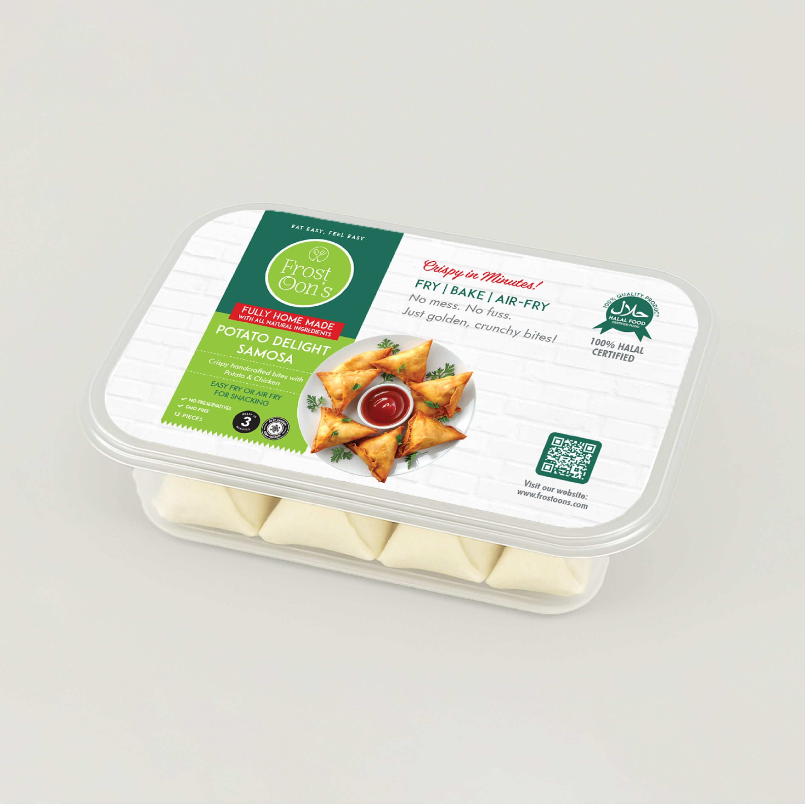 Enjoy the perfect snack with Frost Oon’s Potato Delight Samosa – crispy, fully homemade bites filled with a delicious mix of potatoes and chicken. Easy to air fry, deep fry, or bake!